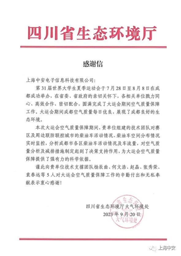 上海市生態(tài)環(huán)境局致上海中安的一封感謝信!(2025-01-10)